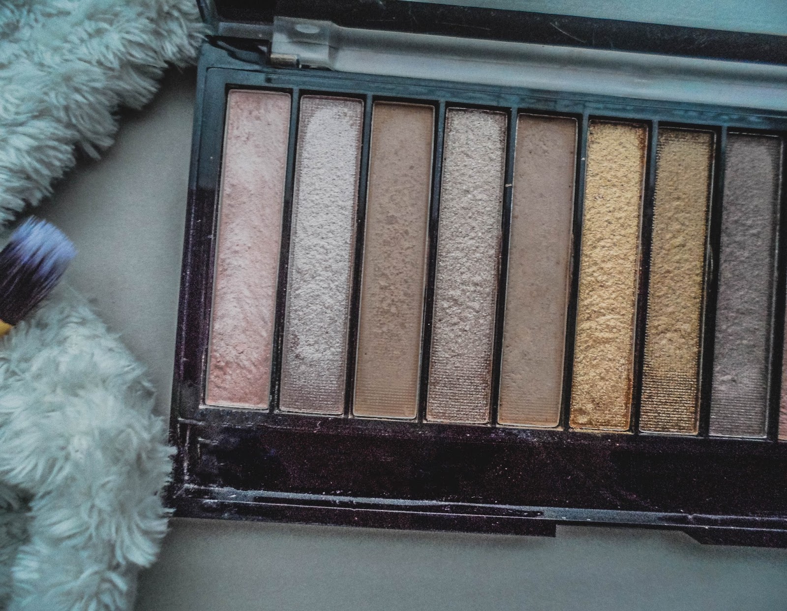 O apie pačią paletę, tai į ją įeina 12 spalvų, kurios tarpusavyje dera. Tad su šia palete galite pasidaryti ir lengvą dieninį akių makiažą ir vakarinį. Iš visų spalvų tik dvi rudo atspalvio yra matinės, o visos kitos likusios turi blizgučių daugiau ar mažiau. Pigmentacija yra tikrai gera už tokią nedidelę kainą. Blizgios spalvos geriau ir stipriau dengiasi pirštu, bet taip būna su dauguma blizgių spalvų, taip pat jos stipriau ir pigmentuotos už matines. Sklaidosi taip pat labai gerai, kai kurios spalvos su šepetėlių šiek tiek sunkiau pasiima, bet labai lengva jas sluoksniuoti ir išgauti sau norima spalvų intensyvumą. Kiek išsilaiko be bazės nežinau, nes mano vokai labai greitai riebaluojasi, tad visada su visais šešėliais naudoju bazę, o su baze išsilaiko tikrai neblogai.